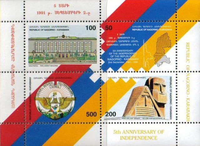 Le 4ème timbre ci-dessus (100 drams) a été émis le 2 septembre 1996 dans un bloc de 4 timbres consacré au 5ème anniversaire de l'indépendance. Ce timbre représente la façade du parlement à Stepanakert.