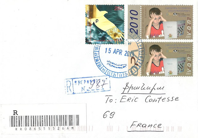 Un de ces 2 timbres EUROPA 2010 figure en 2 exemplaires sur cette intéressante lettre recommandée envoyée le 15 avril 2013 de la ville de Stepanakert, capitale de la république autoproclamée du Haut-Karabakh. Merci beaucoup Sergey :-)