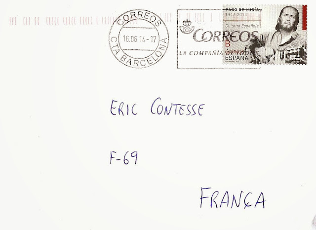 C'est ce timbre autocollant (tarif permanent "B" - lettre jusqu'à 20g envoyé en Europe, soit 0,75€ actuellement) qui a été utilisé sur la lettre ci-dessous postée le 16 juin 2014 de Barcelone. Merci beaucoup Josep :-)