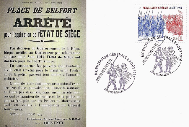 On this First Day souvenir from Morvillars above, published by the Amicale Philatélique de l'Est-Belfort (Aphiest), a poster of the order for the application of the state of emergency ("Arrêté pour l'application de l'État de Siège") of the city of Belfort of August 3, 1914, is reproduced (departmental archives of Territoire-de-Belfort).