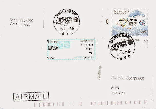 Ji-Ho m'a également envoyé de Nambusan le pli ci-dessus (avec uniquement le timbre à 540 won de cette même série), avec le TAD Premier Jour (en date du 2 octobre 2014 ici).