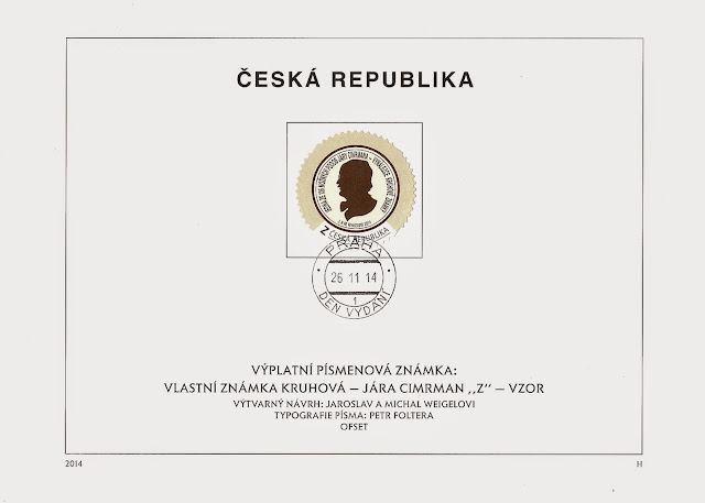 Ce 26 novembre 2014, 2 timbres autocollants ronds (tarif permanent 'A' et 'Z') ont été émis en feuille de 25 timbres, représentant chacun un des 136 profils possibles de Jára Cimrman et la mention "inventeur du timbre rond".