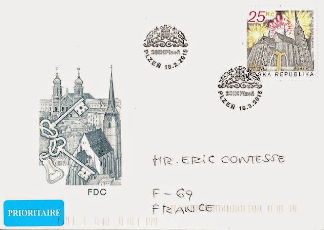 Un grand merci Bret pour ce splendide pli Premier Jour concernant ce timbre (25 CZK), avec TAD spécial de Plzeň, incluant le logo de ce titre 2015 ainsi qu'un motif stylisé rappelant une des portes d'accès à la fameuse brasserie Pilsner Urquell.