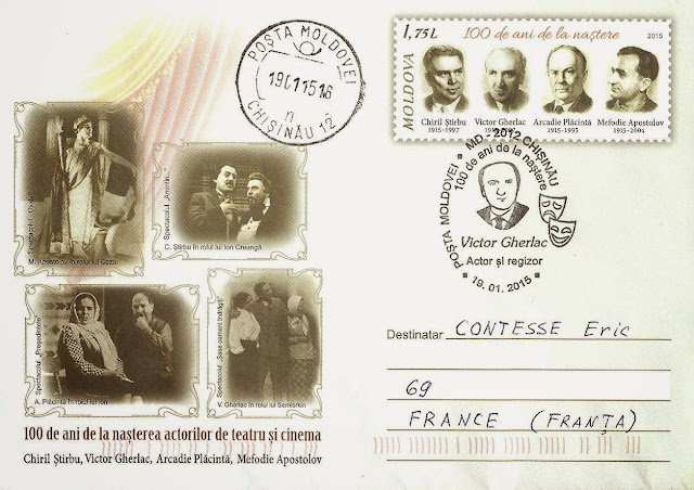 Dans un message récent, j'évoquais l'enveloppe pré-timbrée émise le 17 janvier 2015 par la poste moldave, consacrée au 100ème anniversaire de la naissance de 4 acteurs de cinéma et de théâtre : Chiril Ştirbu (1915-1997), Victor Gherlac (1915-2007),