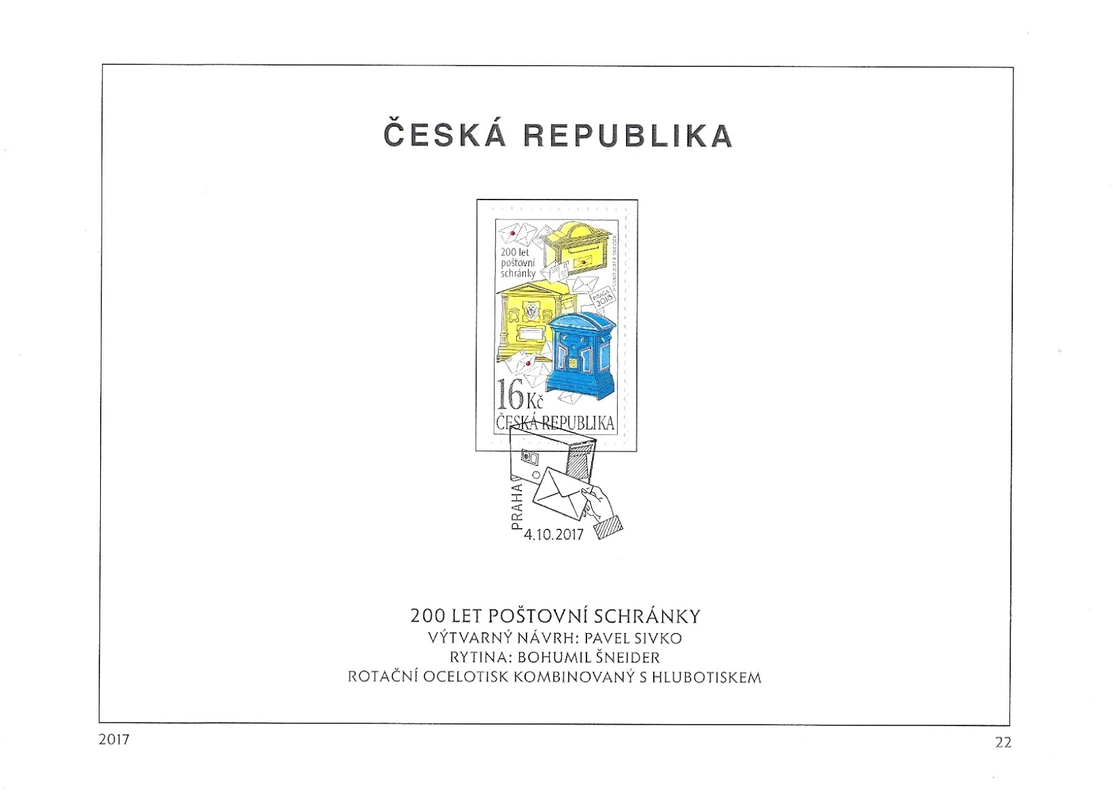 On October 4, 2017, the Czech Post put into circulation a new stamp (16 CZK), designed by Pavel Sivko and engraved by Bohumil Šneider, dedicated to the 200th anniversary of these first letter boxes in the territory.