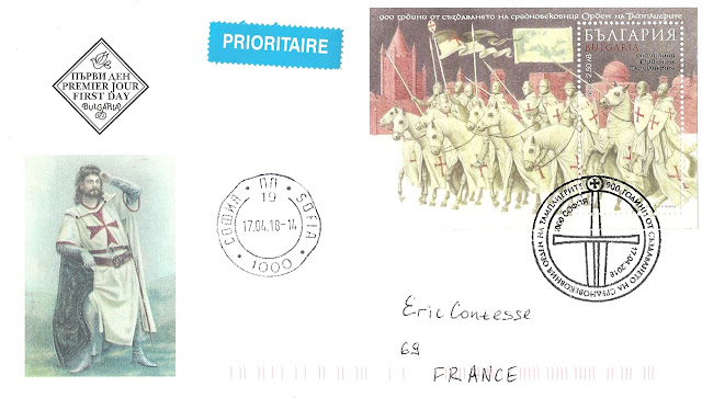 Alors qu'il y aurait très peu de liens historiques avérés entre la Bulgarie et cet Ordre religieux médiéval du Temple ou des templiers, la poste bulgare a déjà consacré plusieurs timbres à ce sujet dans le passé, par exemple en 2007 (700 ans de l'arrestation des membres de cet Ordre) ou 2012 (700 ans de la dissolution de cet Ordre).