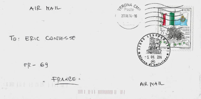 C'est la version italienne de ce timbre qui a été utilisé sur la lettre ci-dessous envoyée le 23 juin 2014 de Vérone. Merci beaucoup Giovanni :-)