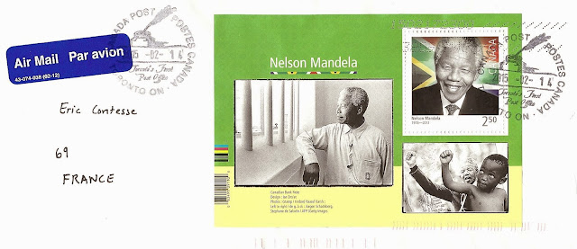 A big thank you Tristan for this nice letter franked with this souvenir sheet (consisting of a $ 2.50 stamp, print run : 150,000) devoted to Nelson Mandela, sent on February 14, 2015 from Toronto :-)