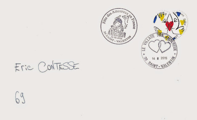 It is that postmark which was applied on February 14, 2015 on the letter below, franked with one of the two heart-shaped stamps designed by Castelbajac, issued on January 26, 2015. Thank you very much Joël :-)