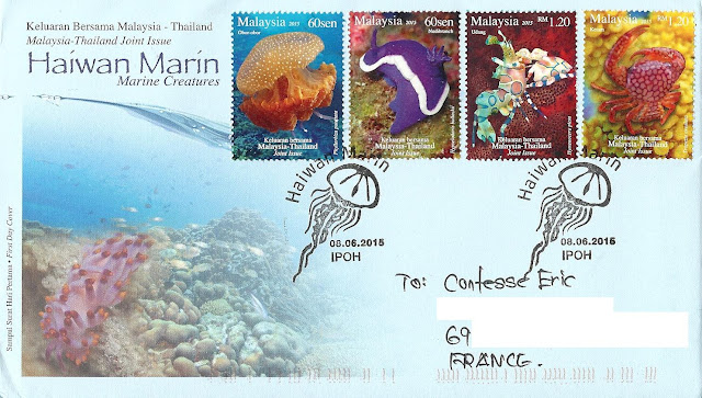 J'aime beaucoup ce FDC officiel de la poste malaisienne ci-dessous avec ce TAD d'Ipoh représentant une méduse et incluant la mention "Haiwan Marin" ("Créatures marines" en malais).