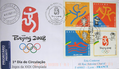 Above the only stamp issued on July 18, 2008 by the Canadian Post to commemorate Canada's participation (340 athletes) to the Beijing Olympic Games. I find this stamp beautiful ! A splendid simplicity and sobriety with this stylish athlete waving the Canadian flag. Note that only the Olympic rings and the words "Canada 52c" also appear on the stamp, without mentioning the city of Beijing... Note also the sobriety of the FDC cover with this flight of doves and the simple FDC cancellation, with "First Day" issue in Golden (!) in British Columbia. Fyi, Canada finished these Games at the 19th rank with 18 medals including 3 gold (rowing, women wrestling and individual jumping, the first of history for this country !).