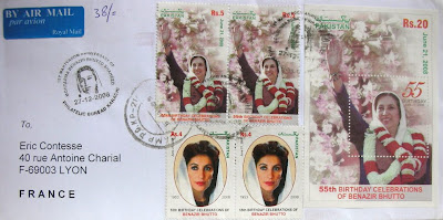 La poste pakistanaise a rendu de nombreux hommages à Benazir Bhutto en 2008. Ci-dessous quelques exemples de timbres qui lui ont été consacrés sur cette jolie lettre postée le 6 janvier 2009 de Karachi.