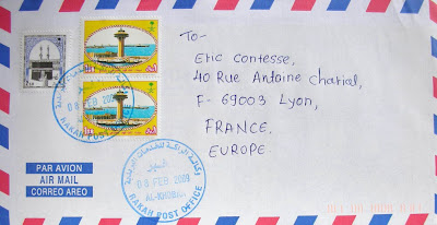 Contrary to the previous one, the blue cancellation (very legible this time) from the Rakah post office in Al-Khobar on the east coast, includes a date in line with our Gregorian calendar (February 8, 2009)...