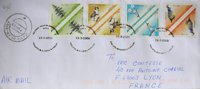 Ces 4 timbres, ayant la particularité d'être de forme triangulaire, figurent chacun en deux exemplaires tête-bêche sur cette très jolie lettre ci-dessous comportant les cachets officiels (sans mention "1er jour") du bureau philatélique de la ville de Karachi.