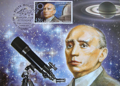La carte ci-dessus (tirage : 2000 exemplaires) concerne donc le 2ème timbre représentant l'astrophysicien moldave Nicolae Donici (1874-1956) dont les principaux travaux ont porté sur le spectre solaire, les comètes, et la planète Saturne, figurant en haut à droite sur cette carte.