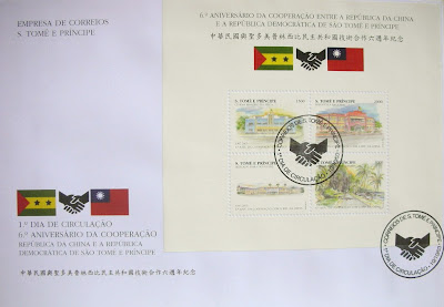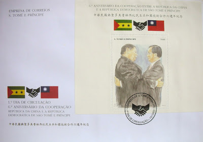 The last souvenir sheet above is depicting a meeting between the President of the Republic of São Tomé and Príncipe, Fradique de Menezes (since 2001) and the former president of Taiwan, Chen Shui-bian (2000-2008).