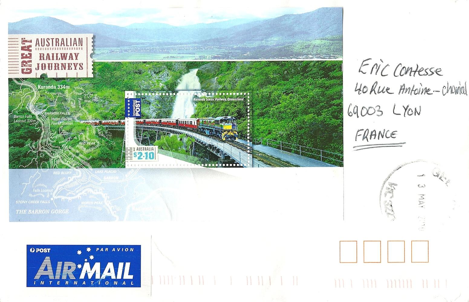 C'est cette ligne de Kuranda qui est évoquée sur le splendide bloc-feuillet sur la lettre ci-dessous, postée le 13 mai 2010 de la ville de Geelong, 2ème plus grande ville de l'état de Victoria, dans le sud-est de l'Australie. Merci beaucoup Ben :-)