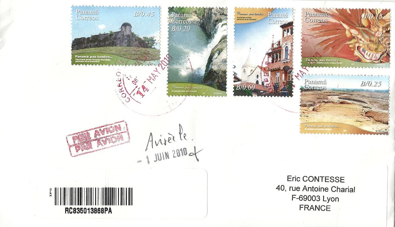 5 timbres de cette série figurent sur la très jolie lettre recommandée ci-dessous postée le 14 mai 2010 de Panama, la capitale.