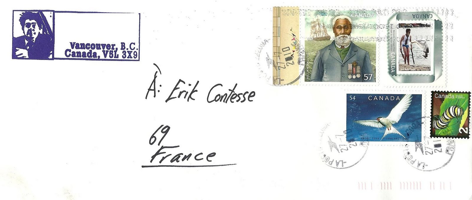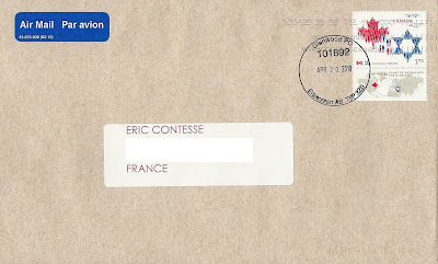 Merci beaucoup Ian pour cette intéressante lettre ci-dessus avec ce Timbre-photoMC en haut à droite :-)Difficile de déchiffrer la date exacte d'envoi de cette lettre postée à Vancouver sur laquelle ont été apposés, le 27 juillet 2010, trois timbres à dates manuels lors de son arrivée à la plate-forme de préparation et de distribution du courrier (PPDC) de Lyon 03 (code 22209A)...