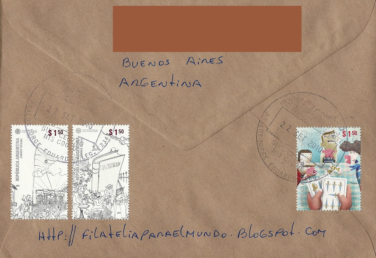 These four stamps are included on the nice cover below, mailed on September 22, 2010 from Buenos Aires. Thank you very much Viviana :-)