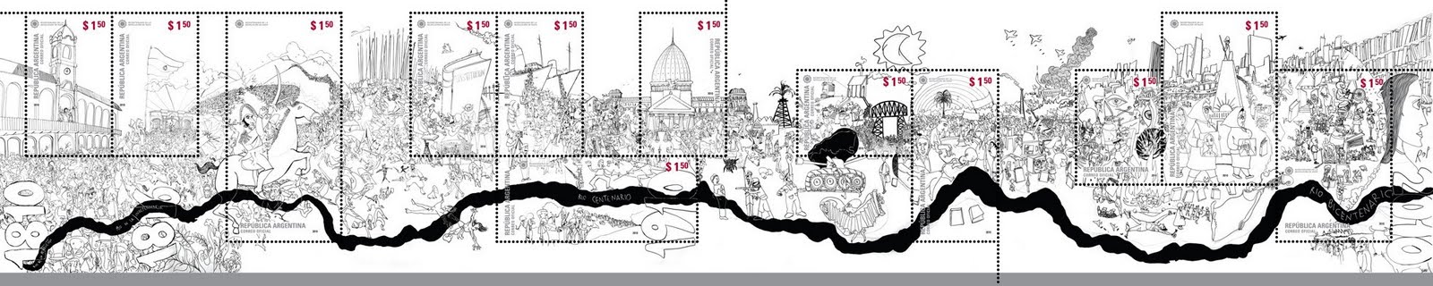 Cette fresque évoque des évènements importants de l'histoire de l'Argentine depuis 200 ans, comme la création du drapeau argentin en 1812 (et l'édifice historique de Tucumán, où le Congrès a déclaré l'indépendance des Provinces-Unies d'Amérique du Sud en 1816) ou la constitution nationale, adoptée par le Congrès constitutionnel dans la province de Santa Fe en 1853, sur les 2 timbres sur la lettre ci-dessus.