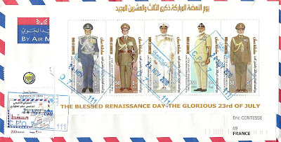 L'administration postale du sultanat d'Oman a commémoré ce "Jour de la Renaissance" en émettant (sans doute le 23 juillet 2010) le bloc-feuillet figurant sur la lettre ci-dessus, postée le 24 novembre 2010 du CPO (Central Post Office) n°111, sans doute situé à Mascate, la capitale. Merci beaucoup Faisal :-)Malgré quelques progrès démocratiques, le sultan Qabus est considéré comme un monarque absolu, également chef suprême des forces armées omanaises.