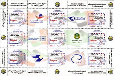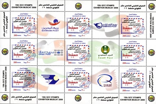 Faisal a également utilisé un timbre isolé sur sa lettre ci-dessus à gauche (200 baisas). Ce timbre, émis le 15 novembre 2009, annonçait la 15ème exposition philatélique du GCC ("Gulf Cooperation Council") organisée à Mascate du 15 au 19 novembre 2009.Ce timbre a en fait été émis en feuille de 9 timbres (voir ci-dessus), tous différents, avec 6 vignettes représentant les logos des postes et les drapeaux des pays faisant partie de cette organisation régionale économique du Conseil de Coopération du Golfe (Bahreïn, Émirats Arabes Unis, Oman, Arabie Saoudite, Koweït et Qatar).