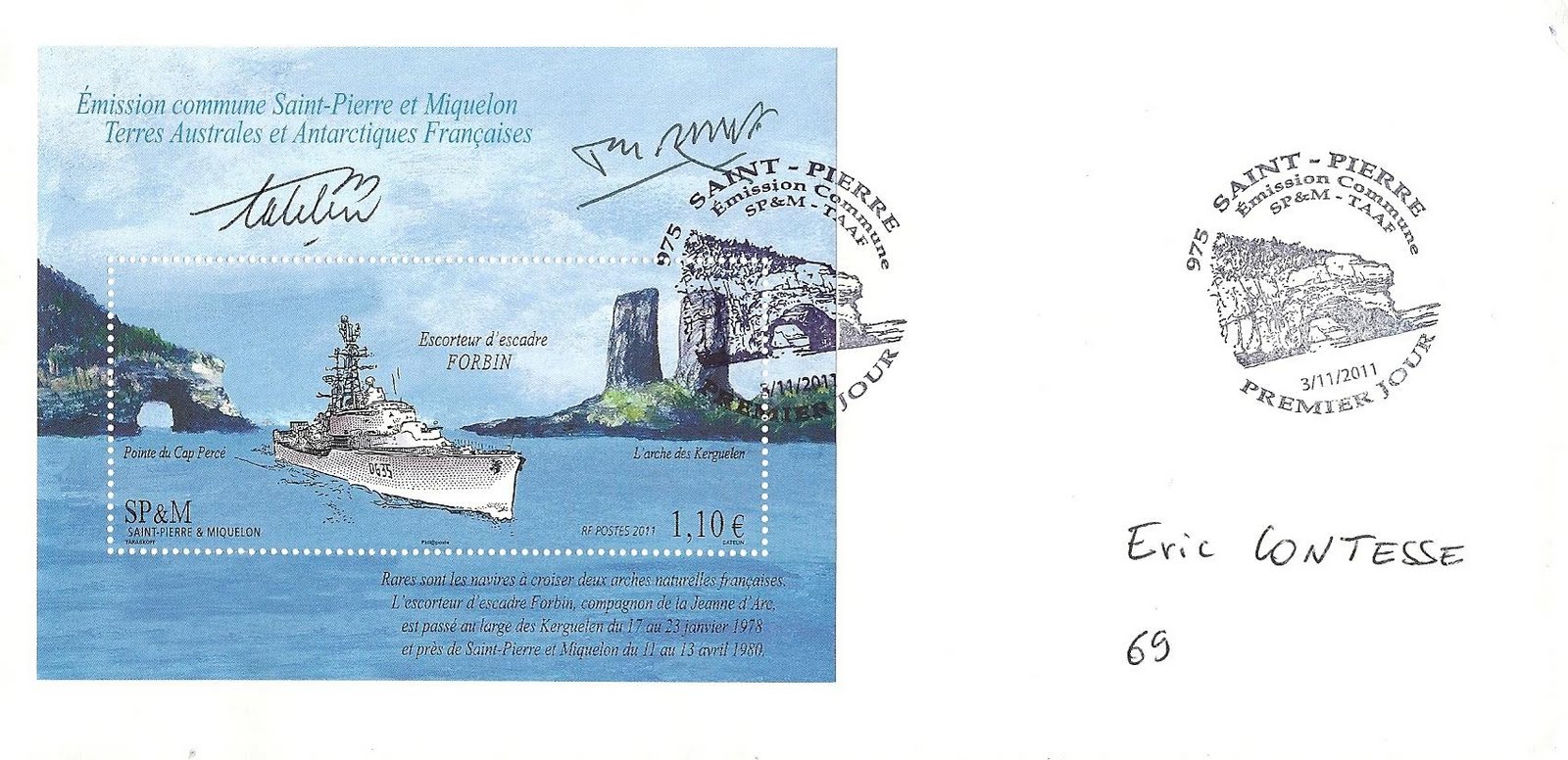 Dans un message publié sur ce blog le 5 décembre 2011, je partageais avec vous le souvenir Premier Jour affranchi avec le joli bloc-feuillet (1,10€) émis conjointement par la poste de Saint-Pierre-et-Miquelon (SPM) et celle des TAAF. Pour rappel, il s'agissait d'une première entre ces 2 territoires français d'outremer.