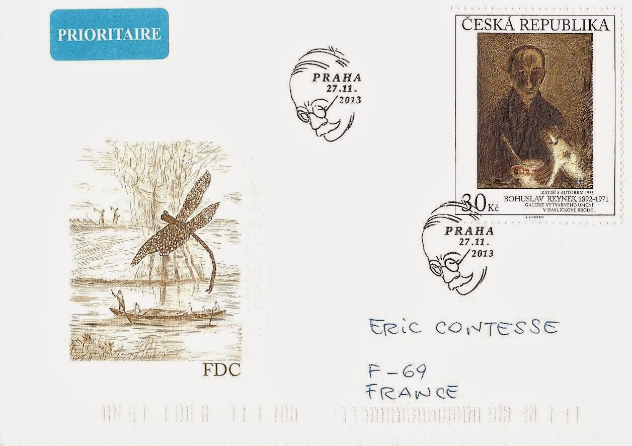 Le TAD Premier Jour, représentant la silhouette de Reynek, a été conçu par Martin Srb, et l'illustration sur cette enveloppe à gauche reproduit une gravure du même auteur, intitulée "Vážka" ("libellule").