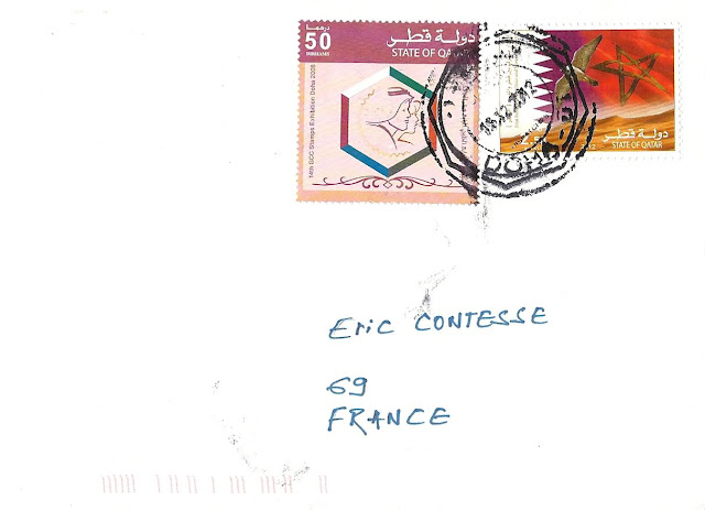 Ce timbre a été émis conjointement avec le Qatar, ce qui explique la présence des drapeaux des 2 pays en arrière-plan. C'est la version qatarie de ce timbre (2,50 riyals) qui figure à droite sur la lettre ci-dessous postée le 18 décembre 2012 de Doha, la capitale. Merci beaucoup Nilesh :-)