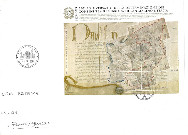 On June 7, 2013, the postal administrations of Italy and San Marino have issued an interesting (and impressive by its size !) souvenir sheet dedicated to the 550th anniversary of the determination of the border between the two countries.