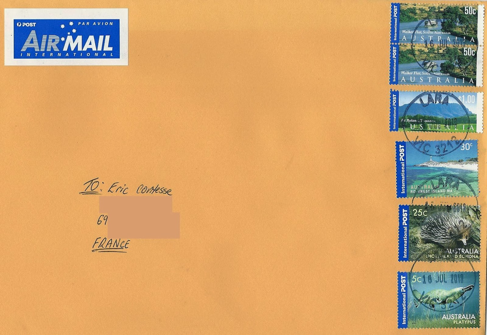 Deux (50c et 1$) des 3 timbres émis ce jour là ont été utilisés en haut à droite sur cette lettre ci-dessous postée le 16 juillet 2013 de la ville de Lara (État de Victoria). Merci beaucoup Ben :-)