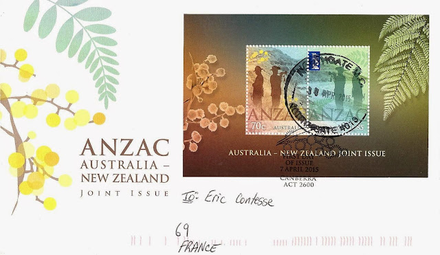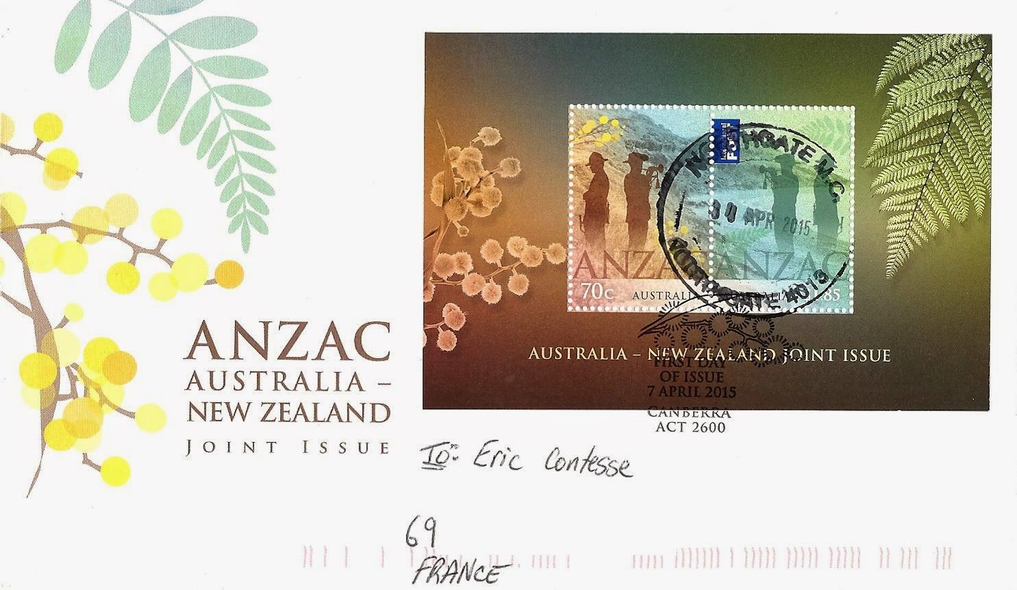 Ben a eu également la gentillesse de m'envoyer le même jour le FDC ci-dessus incluant le bloc-feuillet émis par la poste australienne (un bloc similaire a été émis en Nouvelle-Zélande), avec les 2 mêmes timbres.