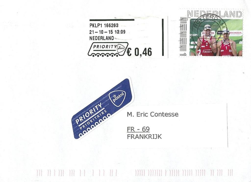 A noter que ce tarif postal "Nederland 1" vaut 0,69€ en 2015 (0,73€ en 2016) et qu'il n'existe qu'un tarif international aux Pays-Bas (1,15€ actuellement pour un envoi jusqu'à 20g), d'où la vignette de complément (0,46€) ajoutée ci-dessus.