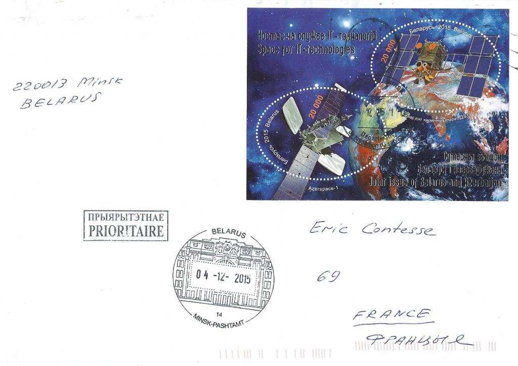 J'ai eu la chance de recevoir cette intéressante lettre, envoyée de Minsk le 4 décembre 2015, affranchie avec la version biélorusse de ce bloc-feuillet. Merci beaucoup Alexander !