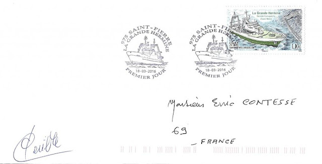I was very lucky to receive the nice First Day Cover above regarding that stamp (€1.10, print run : 60,000) designed by local illustrator Patrick Derible (born in 1956), who signed on the envelope, and engraved by Pierre Bara, with postmarks from Saint-Pierre. Thank you very much André !