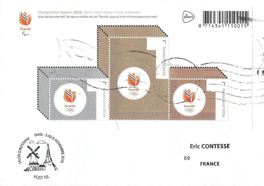 A noter le cachet spécial (moulin et Tour Eiffel) en bas à gauche, édité spécialement par PostNL à l'occasion du dernier Salon Philatélique d'Automne à Paris (les Pays-Bas en étaient le pays invité d'honneur).