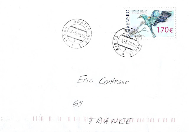 La poste slovaque a mis en circulation, le 3 mai 2019, un très joli timbre EUROPA illustrant cette année le thème des "oiseaux nationaux" (l'aigle semble être considéré comme l'oiseau national en Slovaquie), transformé en "oiseaux rares" à travers ce rollier d'Europe (Coracias garrulus), ailes déployées.