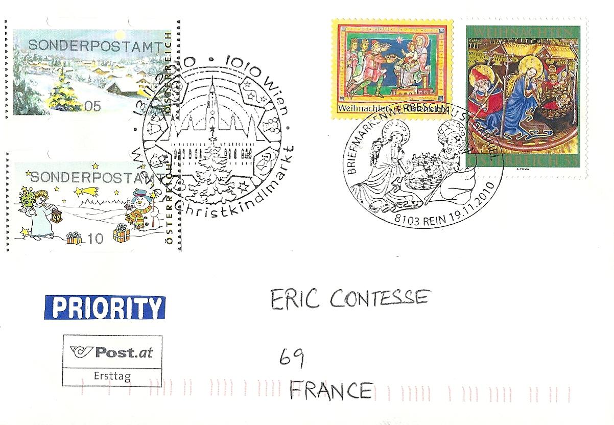Dans un message récent, je publiais une lettre en provenance d'Autriche affranchie avec le dernier timbre de la poste autrichienne consacré aux célébrations de l'Avent. Comme de coutume, un autre timbre, consacré spécifiquement à Noël, a également été émis le 19 novembre 2010.