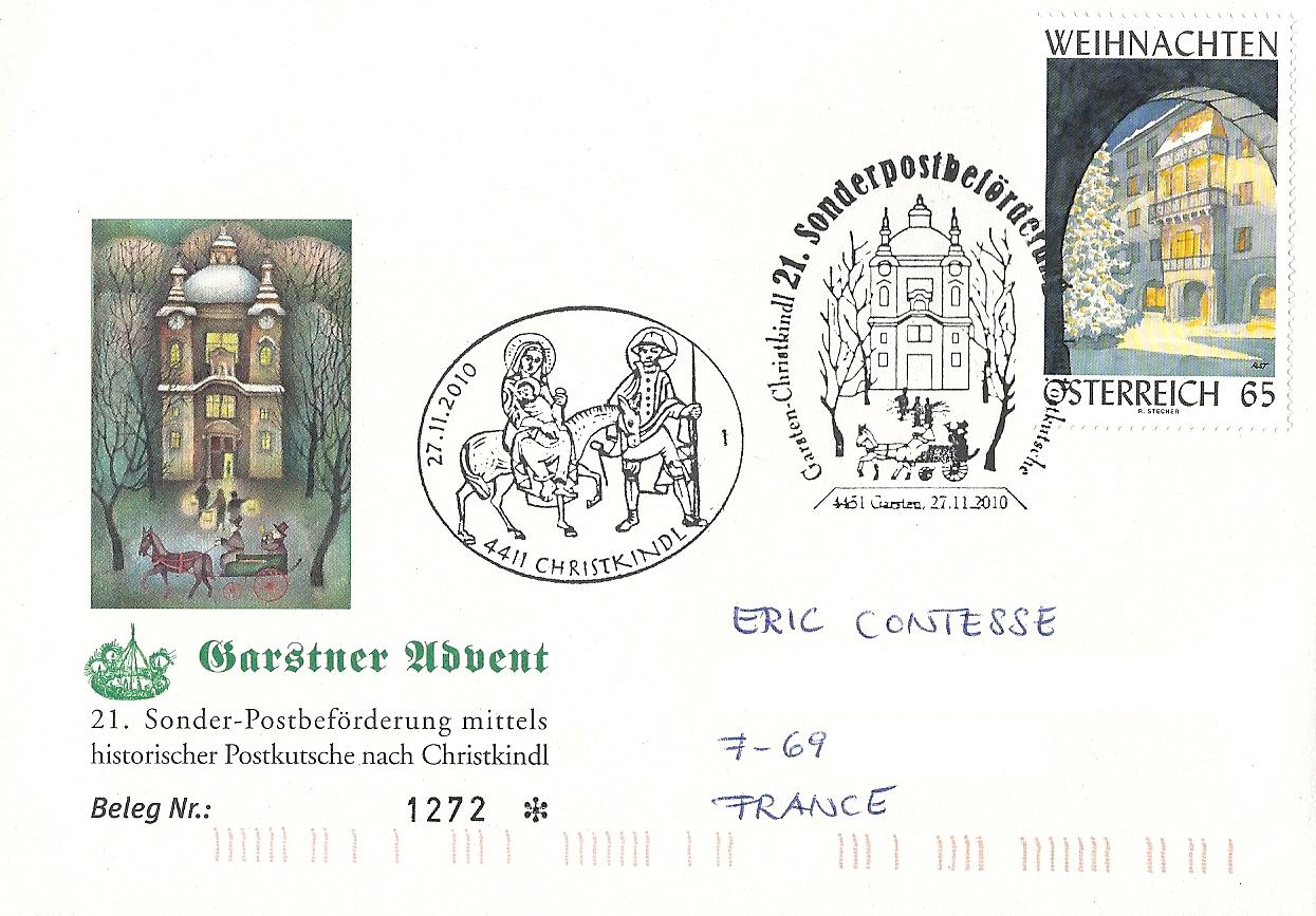 Comme les deux dernières années, Florian (merci beaucoup !) m'a à nouveau envoyé le splendide souvenir ci-dessous consacré au 21ème transport de lettres spécial à bord d'une calèche postale historique qui a eu lieu le 27 novembre 2010, comme de coutume, entre les villages de Garsten et de Christkindl en Haute-Autriche.