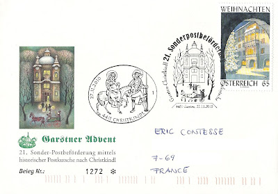 As the last two years, Florian (thank you very much !) has sent me again the beautiful souvenir below dedicated to the 21st special transportation of letters by historic postal carriage that took place on November 27, 2010, as usually, between the villages of Garsten and Christkindl in Upper Austria.