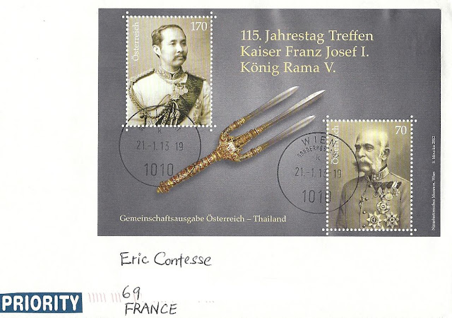 C'est donc le bloc-feuillet faisant partie de ce sachet qui figure sur la jolie lettre ci-dessus postée le 23 septembre 2011 de Vienne. Merci beaucoup Edna :-)A noter que le timbre à date "10 ans du Musée Leopold" concerne un autre timbre émis ce jour-là dont je reparlerai très prochainement sur ce blog...