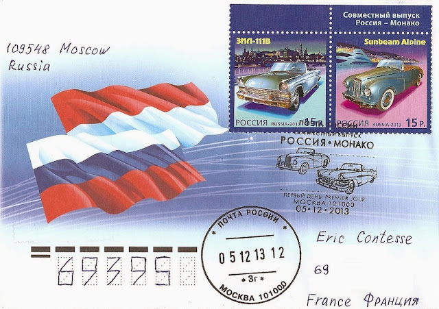 J'ai eu la chance de recevoir cette fois le splendide FDC de la poste russe ci-dessous, avec le drapeau des 2 pays sur l'enveloppe à gauche. Merci beaucoup Alexander :-)