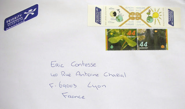 In less than 10 days, I've indeed received three letters from Belgium, the Netherlands and Luxembourg ! I'm a fan of the adventures of Tintin and Snowy therefore very pleased to publish today the nice Belgian cover below. Thank you very much Nicole for this interesting "pig" Mail Art specimen, mailed from Brussels on 26th of May 2009 :-) I let you enjoy the funny priority label with the words "by flying pig" !!! These three € 0.46 stamps are part of a special sheet of 25 stamps, issued on May 22, 2007, with 24 stamps reproducing Tintin's comic strip books covers (in chronological order) and a portrait of Hergé, its creator, on the 25th stamp.