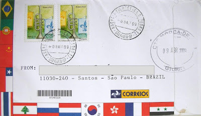 Please note also the postmark of 8th of April 2009 from the Philatelic Agency "Pedro II" of Sao Paulo and the more enigmatic cancellation on the right, in date of 9th of April 2009, seemed to come from a local sorting center (CTC MOOCA-DR-SPM GTURN1)...