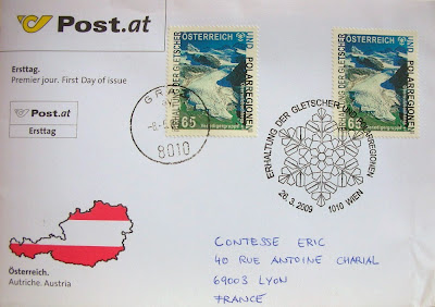 Ce timbre me rappelle le timbre suisse émis dans le cadre de cette même campagne puisqu'il comporte une ligne rouge permettant de montrer la fonte de ce glacier depuis 1932...