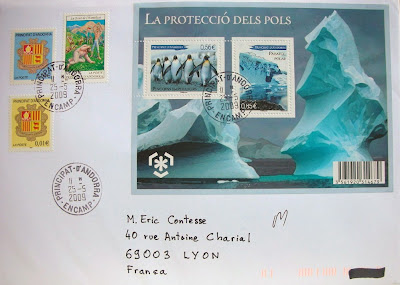 Ce bloc-feuillet andorran figure sur cette splendide lettre ci-dessus postée le 25 mai 2009 d'Encamp, une des 7 paroisses de la principauté.