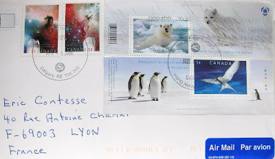 The Canadian Post has issued on 9th of April 2009, two 54c (domestic postal rate for a letter up to 30g) stamps depicting endangered animal species : the Polar Bear (the star of this International Philatelic campaign !) for the Arctic region and the Arctic Tern for the Antarctic region, even if this bird migrates yearly between the two polar areas.