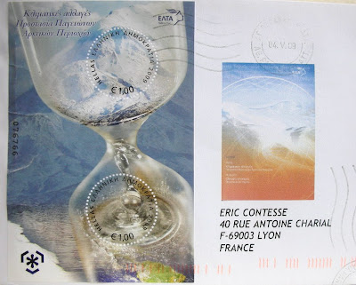 L'emblème de cette campagne, un cristal de glace stylisé, figure bien sûr dans la marge à gauche du bloc ainsi que plus discrètement sur les 2 timbres. Il figure enfin au centre de l'oblitération "1er jour".