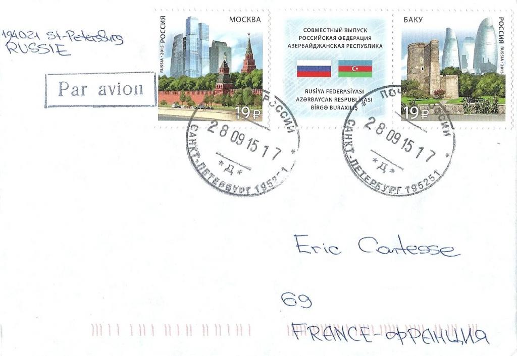 Un grand merci Youri pour cette lettre ci-dessous affranchie avec la version russe de ces 2 timbres (+ la vignette), envoyée le 28 septembre 2015 de Saint-Petersbourg :-)